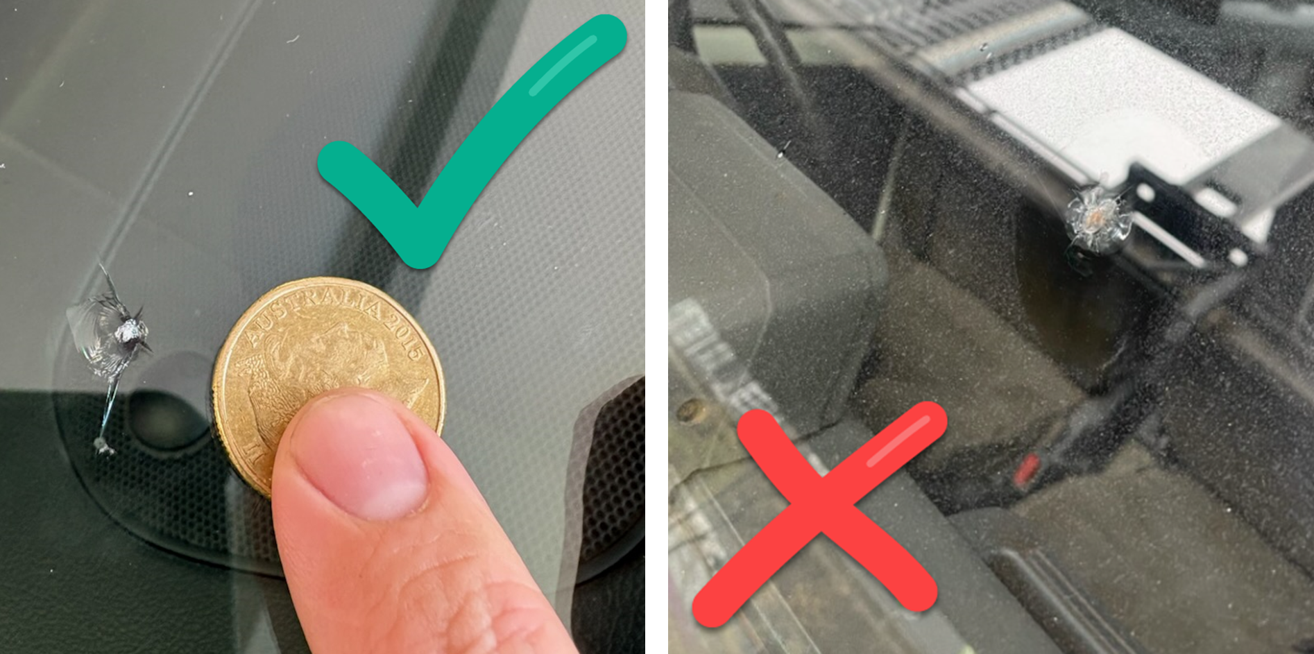 Please take a close-up photo of the chip on the windscreen. Place a coin near the damaged area for scale and capture the photo straight on. Ensure the camera is focused on the chip and avoid as much reflection as possible.